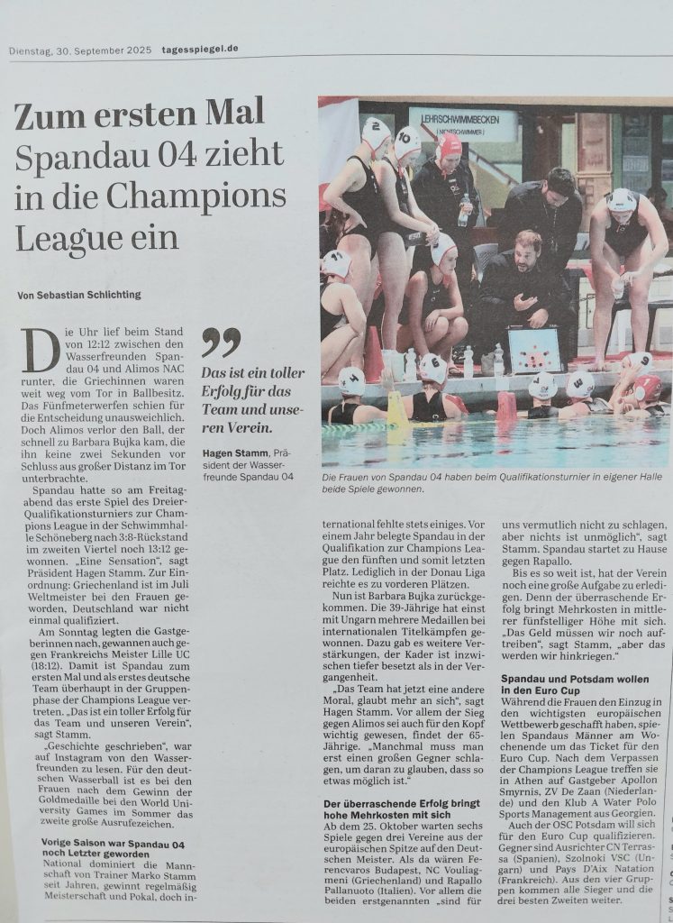 Gegenüber dem Vorjahr haben einige Spieler-Personalien gewechselt und am Beckenrand hat jetzt mit Marin Restovic ein früherer Spandauer Spieler als Trainer das Sagen. Zwar haben die Wasserfreunde vor zwei Wochen in Sabadell (Spanien) bei der Champions League Qualifikation die Teilnahme an der Hauptrunde verpasst, sind aber dennoch mit erhobenem Haupt und gestärkten Selbstvertrauen nach Berlin zurückgereist. Nach zwei knappen Ein-Tore-Niederlagen (11:12 gegen Sabadell, 16:17 gegen Budapest) wurde der notwendige zweite Rang für den Einzug in die CL-Hauptrunde verpasst. Aber das Auftreten des jungen Teams macht Mut und Hoffnung für die nächsten Aufgaben. So gab es auch ein Extra-Lob für Neu Coach Restovic: „Bravo Marin, weiter so als Trainer, du hast dem Team wieder Teamspirit und Selbstvertrauen eingehaucht“, so Präsident Hagen Stamm!“