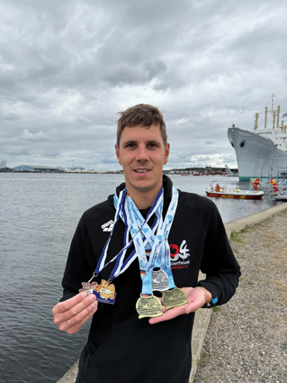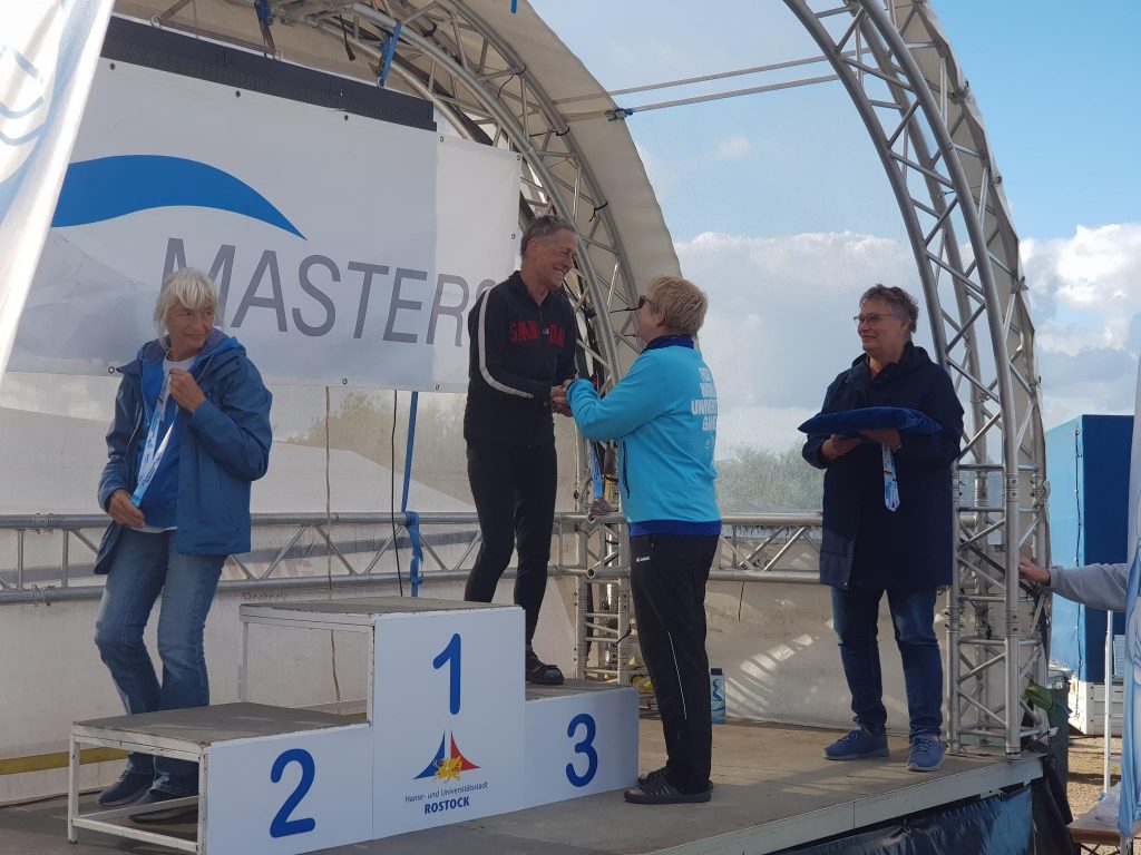 Auch die Masters starteten wie die „Profis“ in Rostock am IGA-Park, um ihre Besten zu ermitteln. Allerdings knapp acht Wochen später. Neu im Programm waren erstmals 1250m, die am Freitag starteten. Der Schwimmkurs war nur durch vier Bojen gekennzeichnet. Eine Runde betrug genau diese neu eingeführte Streckenlänge. Interessant und gut zu schwimmen war die Strecke von der letzten Boje zum Ziel. Immer parallel zum Ufer, dicht neben dem Frachtschiff Dresden. Das Schiff Dresden wurde Ende der 50iger Jahre in der Warnowwerft als 10.000-Tonnen-Stückgut-Frachter mt einer Länge von knapp 160m gebaut. Somit betrug der Schlußspurt für viele knapp 270m, dafür aber wind- und wellenfrei. Das Wetter war leider sehr wechselhaft. Sonne, Wind und Regen, alles war dabei. Die Wassertemperatur betrug am Freitag 20,1 Grad. Deshalb durfte am Freitag nicht mit Neoprenanzug geschwommen werden. Über Nacht wurde es ziemlich kalt und bei einer steifen Brise betrug die Wassertemperatur in der Warnow am Samstag nur noch knapp 18,5 Grad. Der Schiedsrichter hat aus diesem Grund das Tragen eines Neoprenanzuges frei gegeben. Auch am Sonntag schwammen die meisten Athleten mit dem Neoprenanzug. Die Lufttemperatur war mit 16 bis 19 Grad auch nicht wärmer als das salzhaltige und wellige Wasser. Mit sechs Spandauern waren wir gut vertreten. Gleichzeitig gab es auch eine Wertung für Norddeutsche Meisterschaften. Björn Ludwig gewann in der AK 30–34 zwei Titel und eine silberne Medaille. Olli Kusch bei zwei Starts zwei Titel in der AK 55–59.